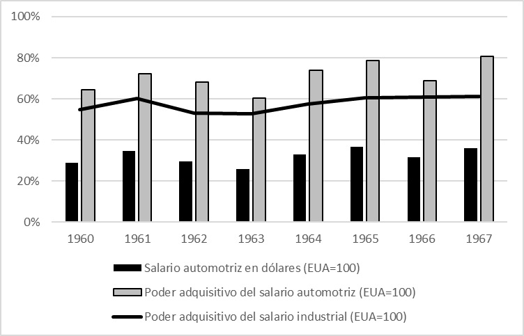 - Cálculo propio con base en datos de Lewis y Bauer, “Wages in Motor Vehicle and Parts Plants, April 1963”; United States Census Bureau, Statistical Abstract of the United States. ↵