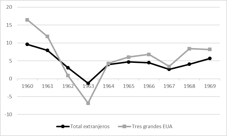 - Eshag y Thorp, “Economic and Social Consecuences”, 30. Sin embargo, estos autores también resaltan que el efecto positivo de los créditos comerciales en la expansión de las importaciones, especialmente en 1961, fue parcialmente contrarrestado por la necesidad de pagarlos en los años recesivos posteriores (1962-1963). La deuda pública externa, en contraste, se mantuvo como fuente neta de ingresos.↵