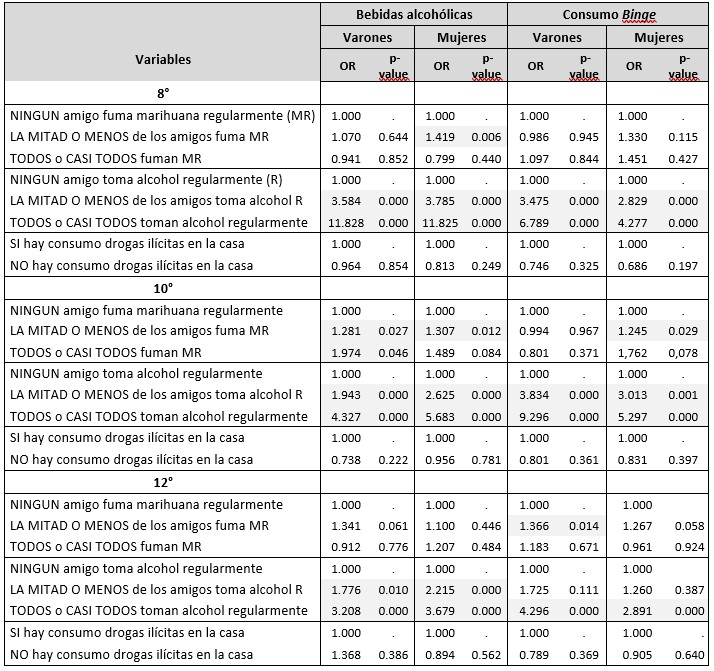 Respecto de la tenencia de amigos que toma alcohol regularmente, tener la mitad o menos de los amigos con este tipo de consumo de alcohol incrementa significativamente la chance de consumo de alcohol tanto en varones como en mujeres y de todas las edades, y más aún cuando todos o casi todos los amigos toman alcohol regularmente. Los datos de la tabla siguiente indica para los varones según grados los siguientes valores OR=11.83*, OR=4.33* y OR=3.21*; y para las mujeres: OR=11.83*, OR=5.68*, y OR=3.68*. En relación al consumo binge, se observa igual impacto del grupo de amigos que consumen de modo regular bebidas alcohólicas, incrementando el valor del OR cuando todos o casi todos lo hacen. En los varones, los valores OR según los cursos son OR=6.79*, OR=9.30* y OR=4.30*. Y en las mujeres: OR=4.28*, OR=5.30* y OR=2.90*.
