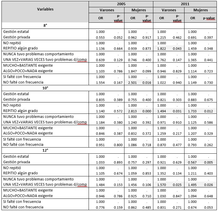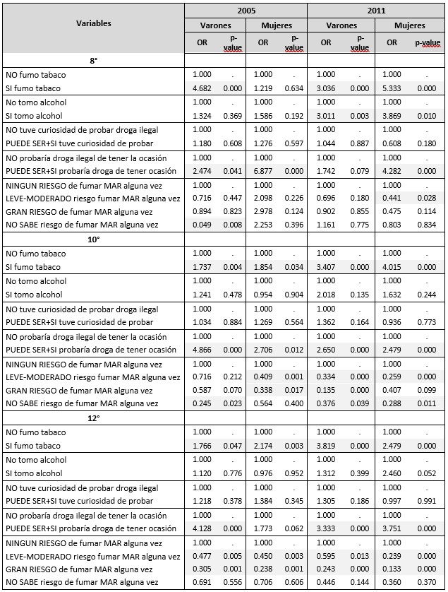 Antes de ingresar al análisis de las variables según género y grados (grupos de edad), la siguiente tabla muestra el impacto que el género, la edad y el tipo de colegio tienen sobre el consumo de marihuana en el último año, en el inicio y fin del periodo analizado. En este análisis, la condición de ser mujeres disminuye significativamente, en relación a la condición de ser varones, la prevalencia de consumo en el año 2011 (OR=0.48*). Estar en los grados 10° y 12° en el año 2005, implica un incremento significativo en la chance del consumo de marihuana (OR=1.70** y OR=2.07*), respecto del 8° grado, en tanto que en el año 2011 no afecta. Es decir, que la edad es un factor predictivo en el consumo de marihuana en el año 2005, incluso más fuerte es la determinación a medida que aumenta la edad, pero deja de serlo en el año 2011. El tipo de colegio no implica mayor o menor prevalencia de consumo de marihuana ni en el 2005 como tampoco en el 2011.