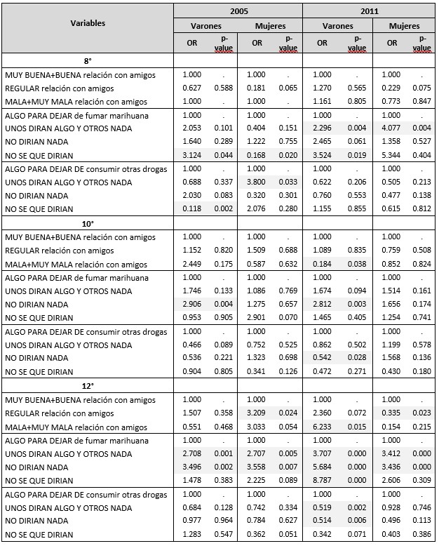Tener una regular o mala relación con amigos, en relación a tener una muy buena o buena relación con amigos es un factor que claramente incrementa la probabilidad de consumo de marihuana en el año 2005 en las mujeres de 17 años y más (12°, OR=3.21**). Hacia el 2011, es un factor que incrementa la chance en los estudiantes varones de 17 años y más (12°, OR=6.23** cuando la relación es mala o muy mala), pero opera en sentido inverso, disminuyendo el consumo en los varones de 15 y 16 años (10°, OR=0.18**) y en las mujeres de 17 años y más (12°, OR=0.34**).