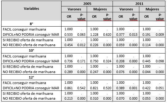Cuando es difícil o imposible conseguir marihuana frente a cuando es fácil, es un factor de protección al consumo de marihuana que no está presente en el año 2005. Y en 2011 se extiende en los varones a todas las edades (8°, OR=0.38**; 10°, OR=0.21* y 12°, OR=0.39*) y a las estudiantes mujeres de 14 años y menos (8°, OR=019**).