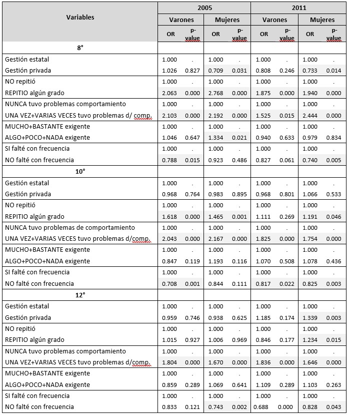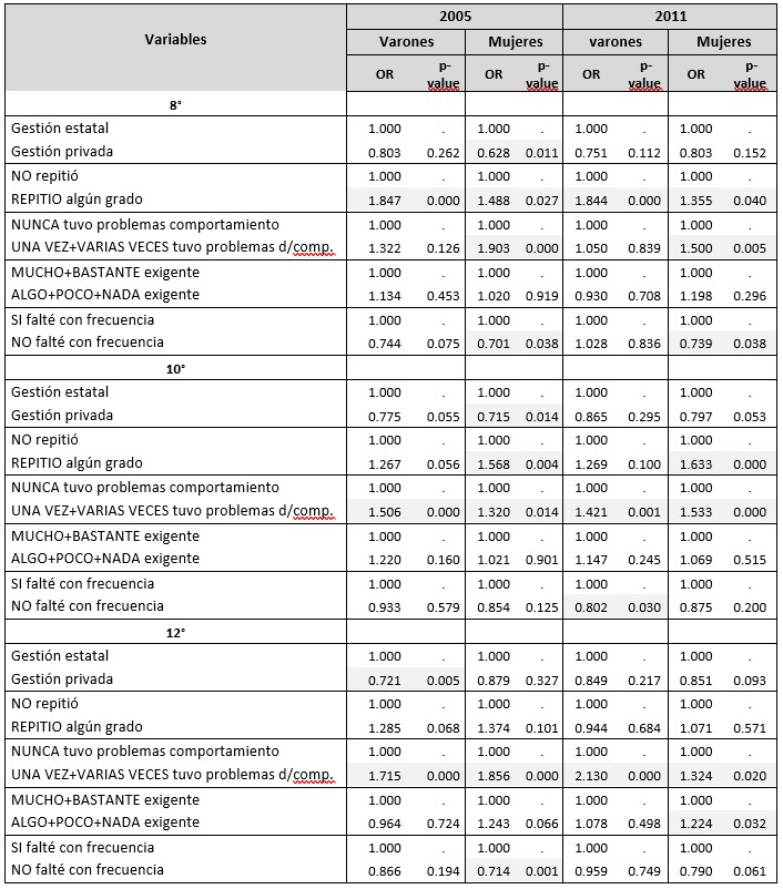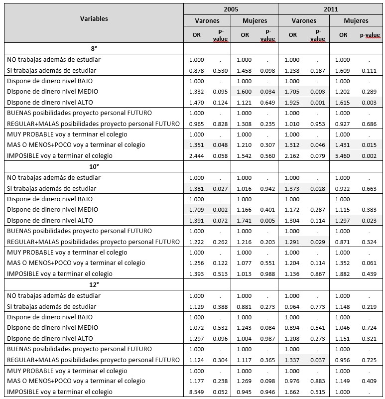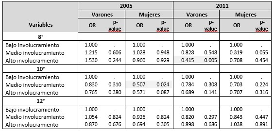 El no haber faltado con frecuencia al colegio cualquiera sea el motivo, implica disminuir la chance de consumo de bebidas alcohólicas en varones y mujeres, tanto en 2005 como en 2011, pero en relación al consumo binge tiene un alcance mayor en las mujeres que en los varones, tanto en 2005 como en 2011.