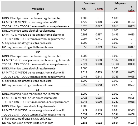 La tenencia de amigos que fuman regularmente marihuana, sin duda es un factor de riesgo importante en el consumo de marihuana que se exacerba cuando son todos o casi todos los amigos que lo hacen regularmente. Los datos indican en los varones y mujeres de todas las edades: en el 8° (OR=3.82** y OR=8.81**), en el 10° (OR=7.82* y OR=19.54*) y en el 12° (OR=5.74* y OR=3.25**). En la tabla siguiente se observa el impacto cuando se tiene la mitad o menos de los amigos que fuman regularmente marihuana.