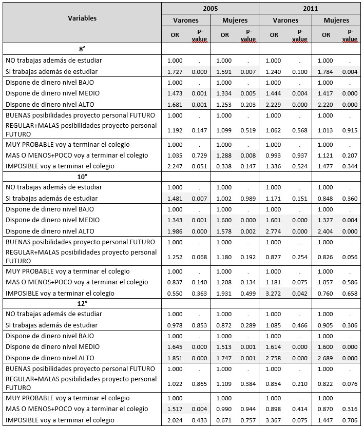 Cuatro factores o variables se analizan en esta dimensión, cuyas categorías ingresadas al modelo expresan posiciones dicotómicas o a lo sumo tres posiciones, que serán analizadas a continuación. Las variables son: si trabaja además de estudiar, la disponibilidad de dinero, las expectativas de realizar un proyecto personal a futuro y las expectativas de terminar el colegio. En las tablas 5.3 y 5.4, se encuentran los resultados en relación al consumo de bebidas alcohólicas en el último mes y al consumo binge, según género, en 2005 y 2011.