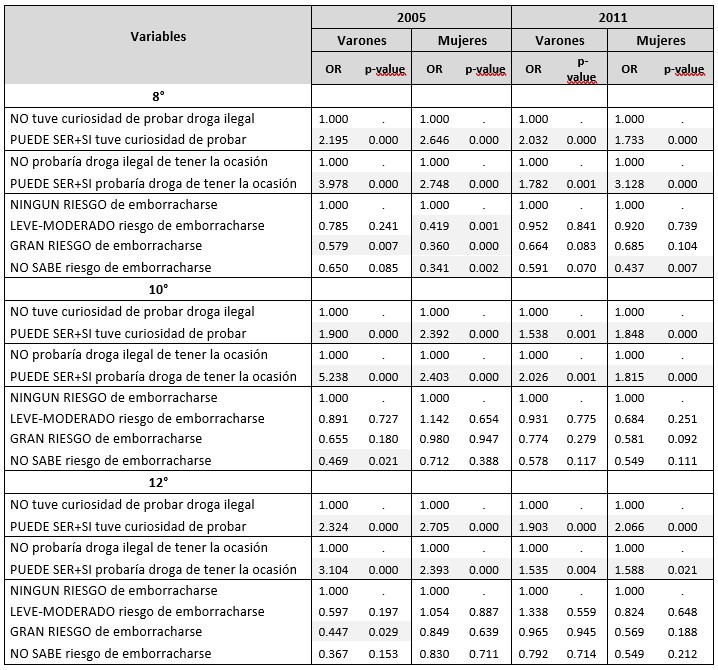 Para analizar los posibles cambios en el periodo 2005 a 2011, se presentan los resultados comparables del modelo para cada año, 2005 y 2011, según las dimensiones de análisis en las que fueron reorganizadas las variables disponibles: personal, escolar, actitud y percepción sobre el consumo de sustancias y atención parental en relación al consumo de alcohol y de marihuana; grupo de pares y accesibilidad a marihuana, sólo para analizar el consumo de marihuana. Se analiza para el año 2011 -por no estar disponibles en el 2005- la dimensión consumo de sustancias psicoactivas en el entorno, como factor de riesgo y protección, tanto para el consumo de mes de bebidas alcohólicas, consumo binge y consumo del último año de marihuana.