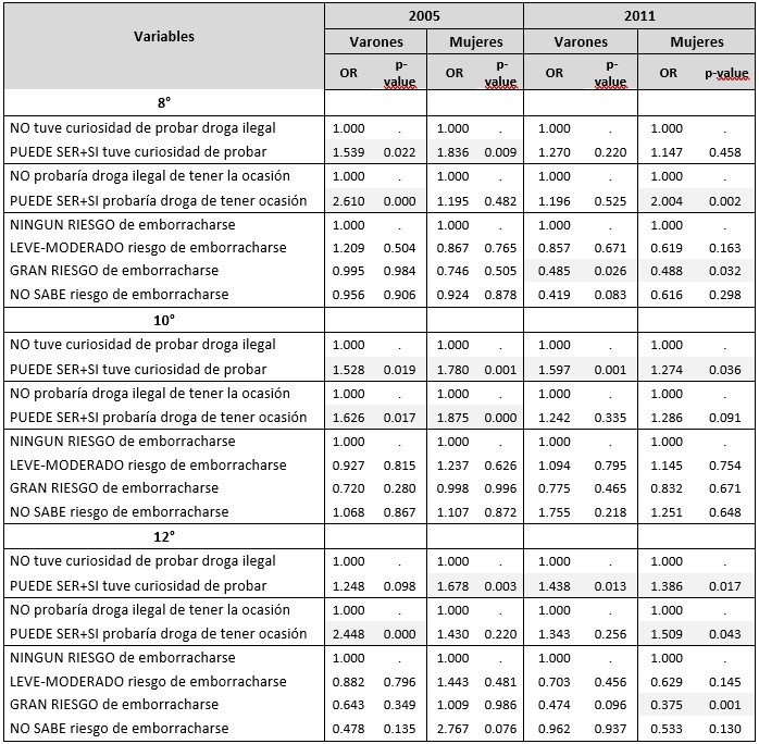 Curiosidad por probar alguna droga ilegal: quienes alguna vez tuvieron curiosidad de probar alguna droga ilegal en relación a quienes no la tuvieron, en el 2005 y 2011 es un factor que incrementa la chance del consumo de bebidas alcohólicas en ambos géneros y en todas las edades, según se observa en la tabla 5.7. En relación al consumo binge en el 2005, incrementa la chance de este consumo en varones de 14 a 16 años (del 8°, OR=1.54** y del 10°, OR=2.61*), y en las mujeres de todas las edades (8°, OR=1.84**; 10°, 1.78* y 12°, OR=1.68**). Hacia el 2011, la curiosidad por probar alguna droga ilegal incrementa la prevalencia de consumo binge, en varones y mujeres de 15 y 16 años, que se encuentran en el 10° (OR=1.60* y OR=1.27**) y de 17 años y más, del 12° (OR=1.44** y OR=1.39**).