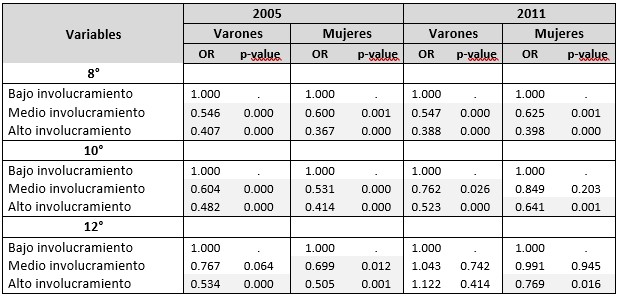 En relación al consumo binge, tener medio o alto involucramiento parental reduce la chance de este consumo en ambos géneros y en todos los grupos de edad en el año 2005; mientras que en el 2011 el impacto del nivel alto se observa en los varones de todas las edades (en el 8°, OR=0.63**, en el 10°, OR=0.72** y en el 12°, OR=0.67**) y en mujeres de 15 a 16 años (del 10°, OR=0.54*).