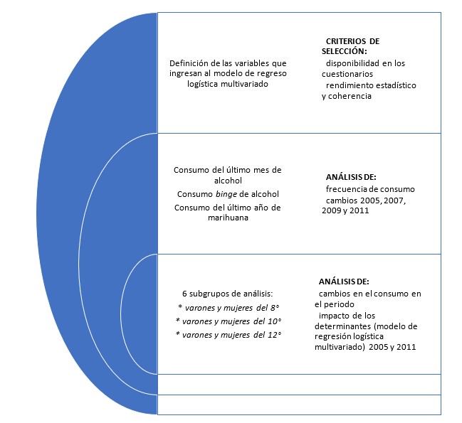 Una vez definido el modelo multivariado, se inicia el análisis de los seis subgrupos poblacionales, tanto para el año 2005 como para el año 2011, con el objetivo de analizar el peso de los factores de riesgo y de protección en cada año sobre los tres consumos definidos –bebidas alcohólicas, consumo excesivo de alcohol y marihuana-, y los posibles cambios según género en estudiantes del nivel medio en Argentina. El gráfico siguiente muestra cómo se organizó el proceso metodológico y de análisis estadístico para abordar los objetivos planteados en la tesis.