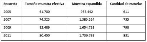 Tipo de muestra: probabilística, bietápica, estratificada en la primera etapa de selección. Las unidades de la primera etapa son los establecimientos educativos del nivel medio (según la base del total de establecimientos escolares del nivel medio proporcionada por el Ministerio de Educación de la Nación). Las unidades de segunda etapa son las aulas. Las aulas se estratificaron según nivel (cursos del 8°, 10° y 12°) y turno (matutino, vespertino y nocturno). Se selecciona aleatoriamente un mínimo de un aula por nivel y turno, y dentro de cada aula seleccionada se encuestan a todos los y las estudiantes presentes y que voluntariamente acepten participar. La muestra tiene representación provincial y nacional, sin embargo, diferentes problemas en el trabajo de campo dificultaron la inclusión de algunas provincias en la base nacional. Debido a que el peso relativo de las provincias ausentes (no las mismas en los diferentes años) en la matrícula nacional es menor, estas ausencias no afectan la lectura nacional. Las provincias faltantes y sus pesos relativos en las matrículas[12] se detallan del siguiente modo: en el año 2005, La Rioja 0,99%, y en el año 2007, Formosa 1,51% y Neuquén 1,53%. En la tabla siguiente se muestra el tamaño de la muestra efectiva en cada estudio, es decir, la cantidad de estudiantes que respondieron el cuestionario; la cantidad de estudiantes representados (expresado en el tamaño de la muestra expandida) y la cantidad de escuelas que participaron en el estudio, es decir, que fueron elegidas aleatoriamente según el diseño muestral explicado. Como se observa, los tamaños van incrementándose en cada estudio, debido a la expansión de la matrícula escolar en estos años, que luego de la crisis socio económica del país en el año 2001, el proceso empieza a revertirse.