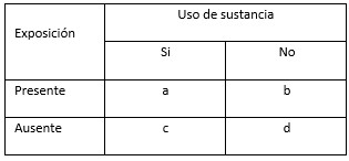Según lo anterior, la estimación del odds-ratio se presenta como el cociente entre el uso y no uso de sustancia entre los expuestos, es decir a/b, y el cociente entre el uso y no uso de sustancia entre los no expuestos, es decir c/d, de tal forma que