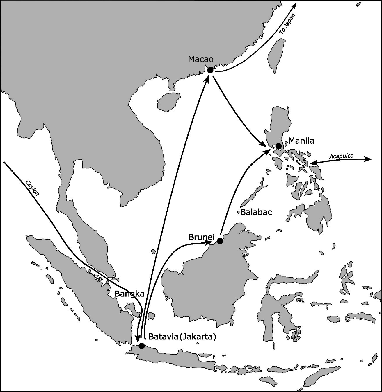 The next line mentions the English pirates coming around Cape Horn to sack Lima and Guayaquil, or to prey on the galleon at Cabo San Lucas and Las Marianas (as quoted earlier), which implies a very wide range indeed. Calderón also envisions a presidio on the Island of Balabac (which lies between Palawan and Brunei, on the route between Dutch Jakarta and Manila) with “five fragatas of 40 and 30 cannons”, which he envisions the residents could use to undertake trade with China and Bengal on behalf of Manila. Finally, he points out that it would be convenient for the merchants of Manila to have a ship at hand for occasional voyages directly to Cádiz around the Cape of Good Hope, in addition to the two larger galleons (one to sail to Acapulco, and one to return from Acapulco each year). Calderón’s vision was as wide as the Pacific Rim (Figure 5).