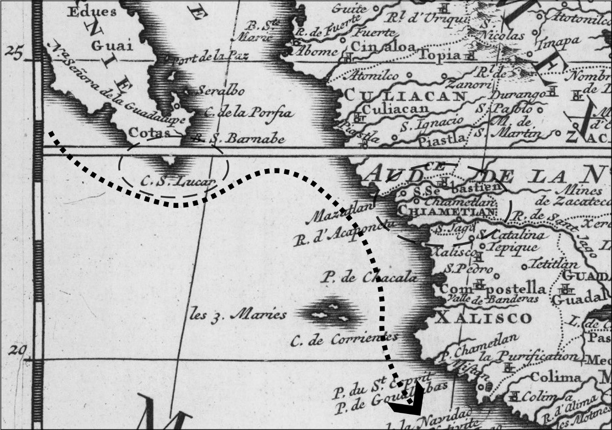 Figure 3. The galleon sailed between Cabo San Lucas and Cabo de Corrientes en route to Acapulco[35]