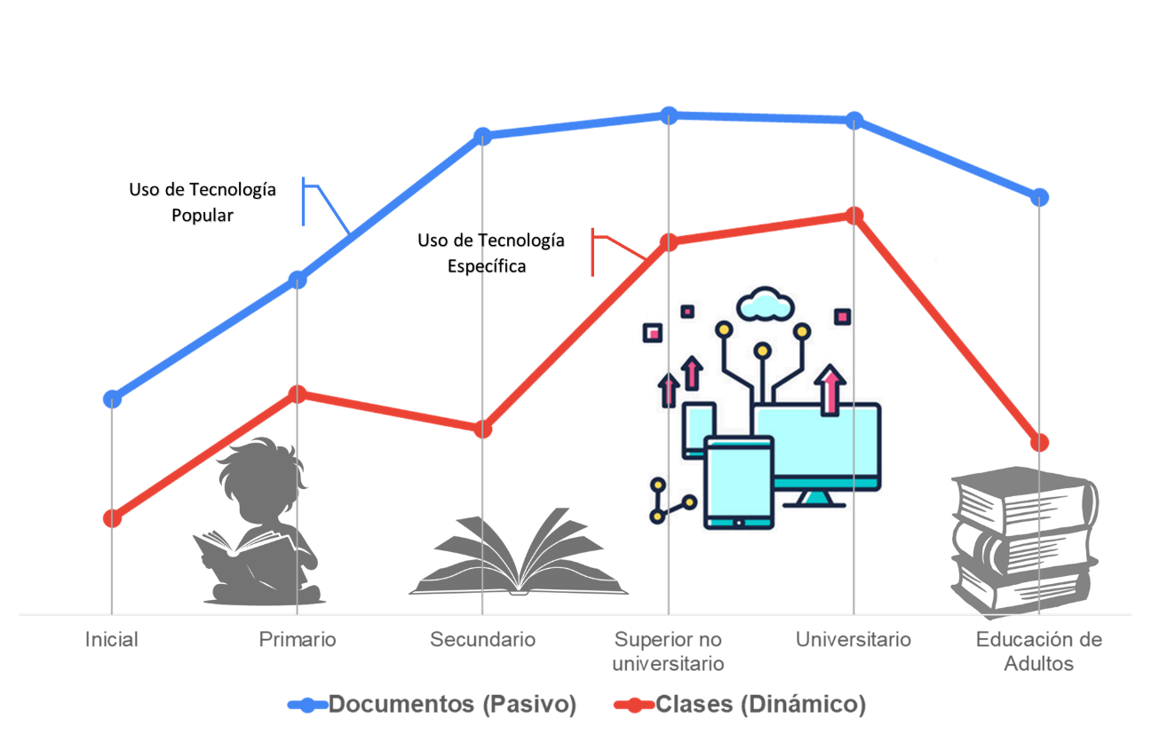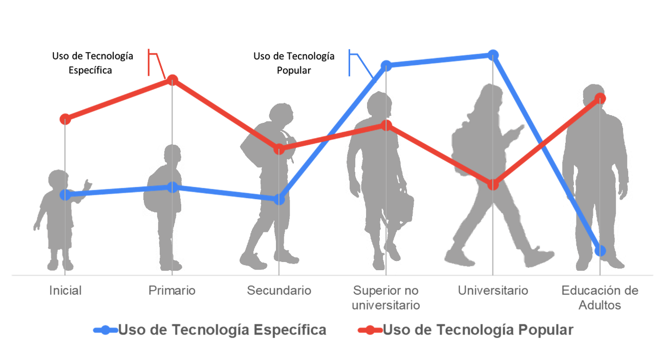 Al desglosar el uso de tecnologías por cada nivel educativo, notamos algunas tendencias interesantes (cf. figura 5):