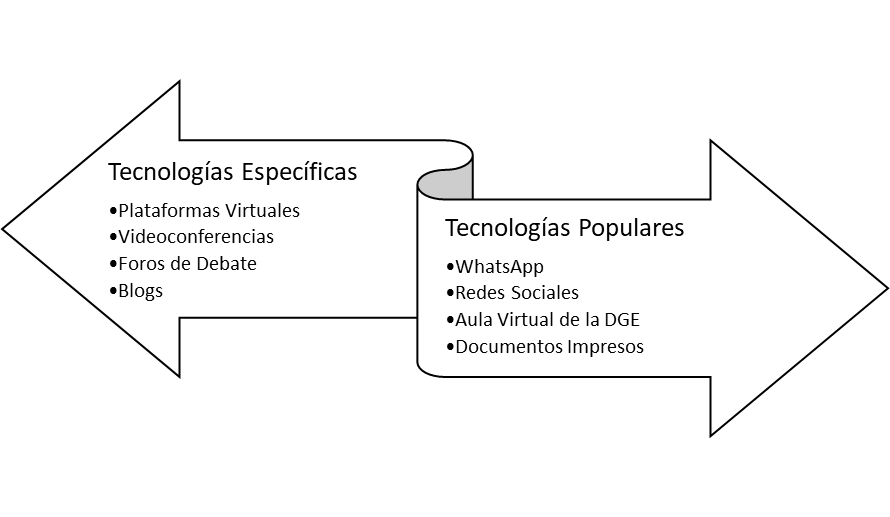 El análisis factorial del instrumento identificó dos grupos principales de tecnologías: tecnologías específicas y tecnologías populares. Las tecnologías específicas, como plataformas virtuales, videoconferencias, foros de debate y blogs, requieren conocimientos técnicos para su uso. En contraste, las tecnologías populares, que incluyen WhatsApp, redes sociales, el aula virtual de la Dirección General de Escuelas (DGE) y documentos impresos, son más accesibles y no necesitan habilidades técnicas especiales (cf. figura 2).