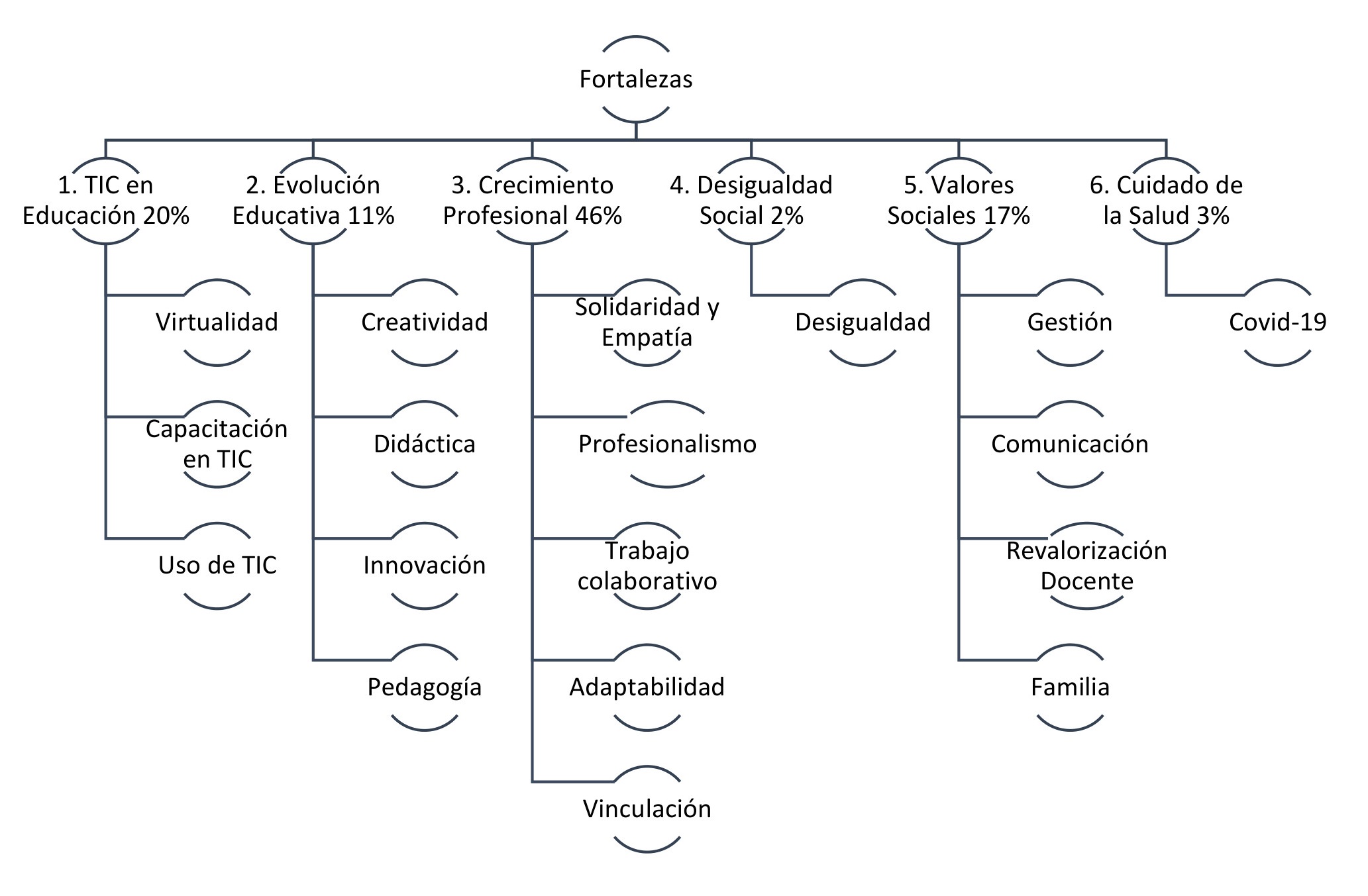 Dado que cada encuestado podía aludir a más de una fortaleza, fue posible identificar 1.527 respuestas. En consecuencia, se elaboraron seis categorías explicativas: TIC en educación, evolución educativa, crecimiento profesional, desigualdad social, valores sociales y cuidado de la salud.