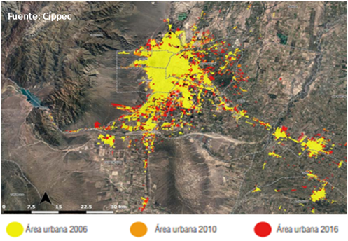Entre 1988 y 2015, la superficie urbana dentro de este Oasis Norte de la provincia aumentó casi un 90% avanzado, básicamente, sobre áreas cultivadas de los departamentos de Luján, Maipú y sobre todo de Guaymallén, lo que se constituyó en una pérdida irreversible de tierras productivas porque nadie va a voltear casas o ir contra barrios en donde ya hay una estructura y una organización edilicia que sería imposible de volver hacia atrás. Por lo tanto se considera este avance como una pérdida irreversible de tierras productivas. Además de la presión del crecimiento urbano sobre las zonas rurales, se debe considerar también la presión rural ejercida sobre el secano, la cual también ha provocado diferentes tipos de conflictos socioambientales y ha ido definiendo una interfaz rural secano.