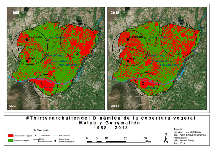 Figura 2. Avance de las ciudades en Guaymallén y Maipú – 1988 y 2018. Cambios en las coberturas vegetales. Fuente: https://bit.ly/3Ol2t4N. Perez, M., del Barrio, L. & Colomer, J. (2020).