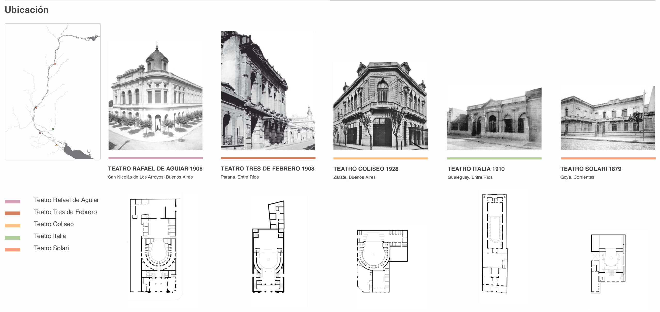 Los teatros de los que contaremos fragmentos de sus historias son cinco y no son, como suele decirse, una muestra representativa de alrededor de los 20 que orbitaban en torno al río Paraná y sus afluentes. Y no lo fueron, deliberadamente, en cuanto se intentó reflexionar sobre posibles convergencias, pero a partir de un abanico inicial de diferencias. Los teatros escogidos habían sido creados en 5 ciudades en los bordes del río Paraná, entre 1877-1879 (Goya) y 1928 (Zárate). Más allá de los cambios de nombre que podían o no implicar un cambio de propiedad, se priorizó la continuidad de la planta. Eran el teatro 25 de Mayo (luego Elsa, luego Isabel, hoy Solari) de Goya, el Teatro Tres de Febrero de Paraná (que sucedía a otro precedente del mismo nombre), 1908, el Teatro Municipal, hoy Rafael de Aguiar, de San Nicolás (1908), el de la Sociedad Italia de Gualeguay, sobre un afluente que vertía su producción y sus comunicaciones también sobre el Paraná (1902-1910) y el Teatro Coliseo de Zárate (ver mapa 1).