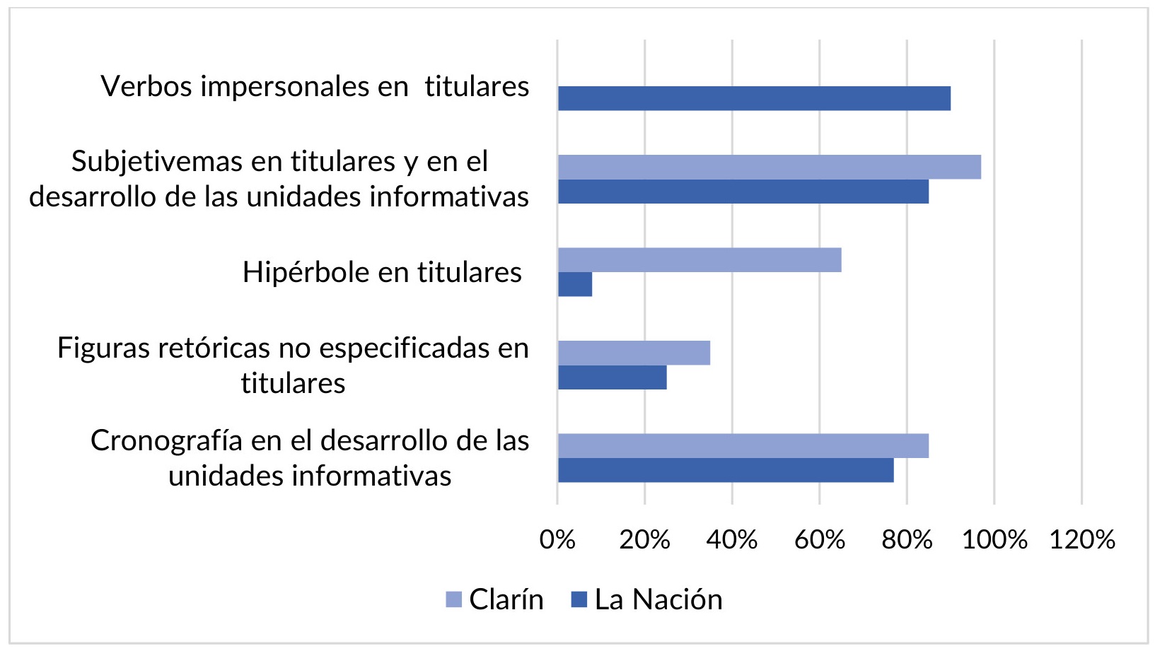 En perspectiva comparativa, no hay diferencias acentuadas entre ambos diarios en cuanto a la utilización de subjetivemas en titulares y en el desarrollo de las noticias para caracterizar el tipo de delito, la víctima o el victimario, como tampoco en la apelación a la cronografía como figura retórica predominante en el desarrollo de la noticia. En donde se verificaron mayores discrepancias es en el uso de la hipérbole como figura retórica para titular, y Clarín resultó el que más utiliza ese recurso, mientras que La Nación apela a la utilización de verbos impersonales en titulares, forma expresiva que no se reconoció en Clarín (véase figura 1).