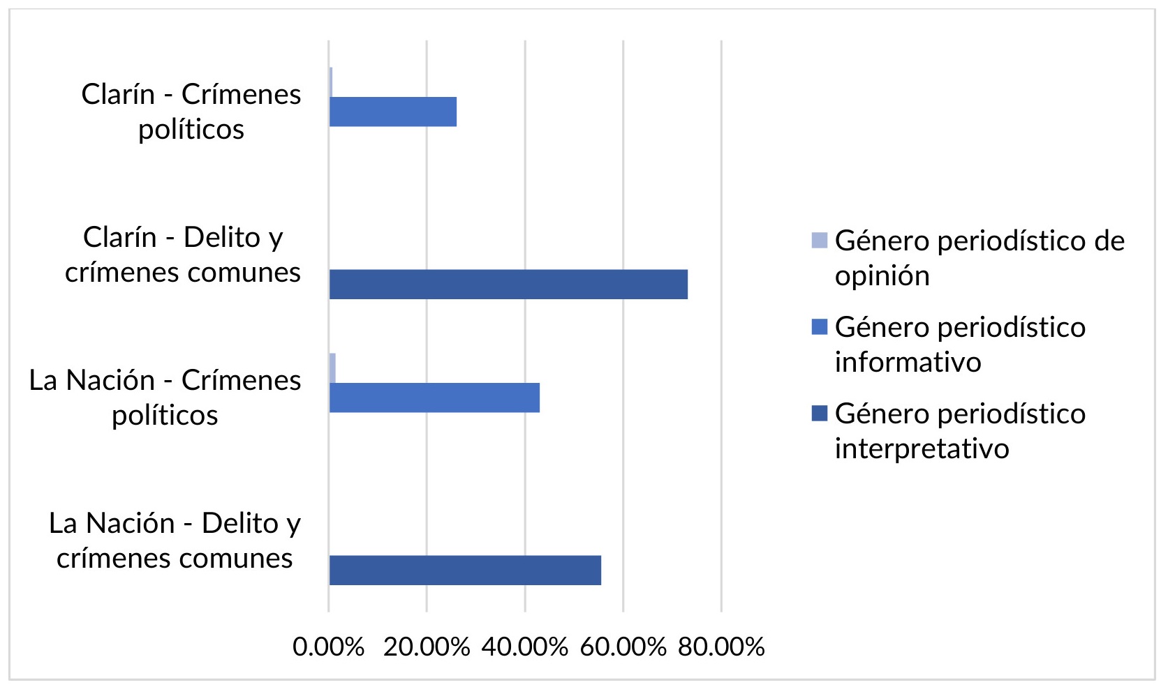 Figura 2. Géneros periodísticos utilizados en La Nación y en Clarín en noticias policiales y en noticias sobre asesinatos políticos