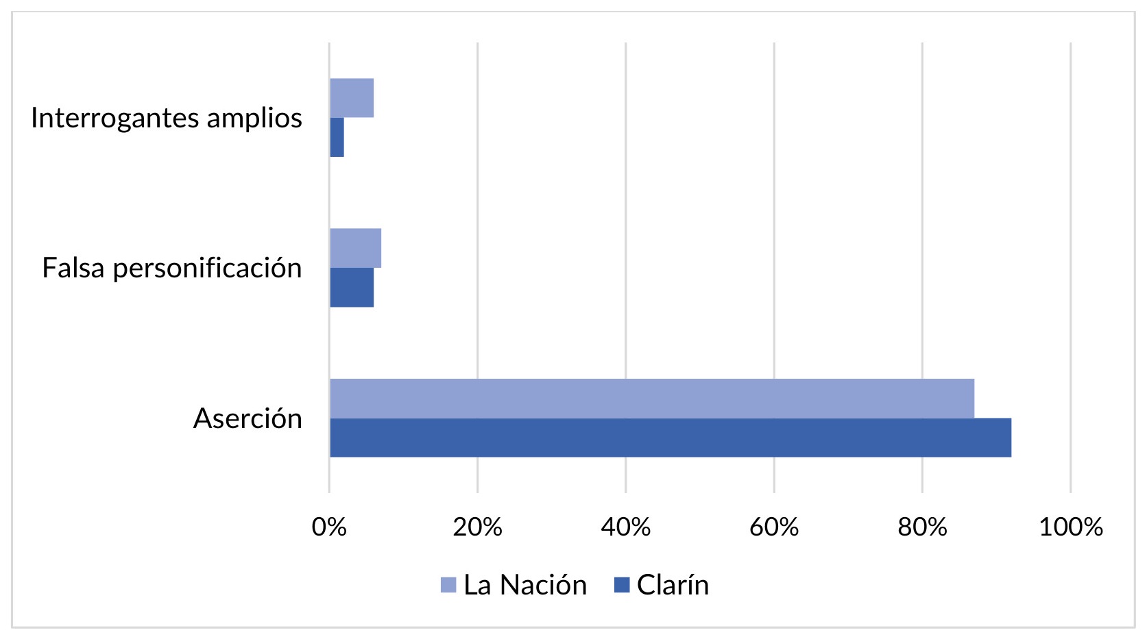 En relación con los recursos expresivos utilizados para titular y para construir un vínculo con su lectorado, se identificó que en La Nación se utilizaron en el 87 % del corpus las aserciones. En un 7 %, las falsas personificaciones –citas directas obtenidas de declaraciones que se entrecomillan y emplean para titular–, y en el 6 %, interrogantes amplios. En el caso de Clarín, se relevó que el 92 % de las formas de titular fueron aserciones, el 6 %, falsas personificaciones, y el 2 % restante, interrogantes amplios (véase figura 3).