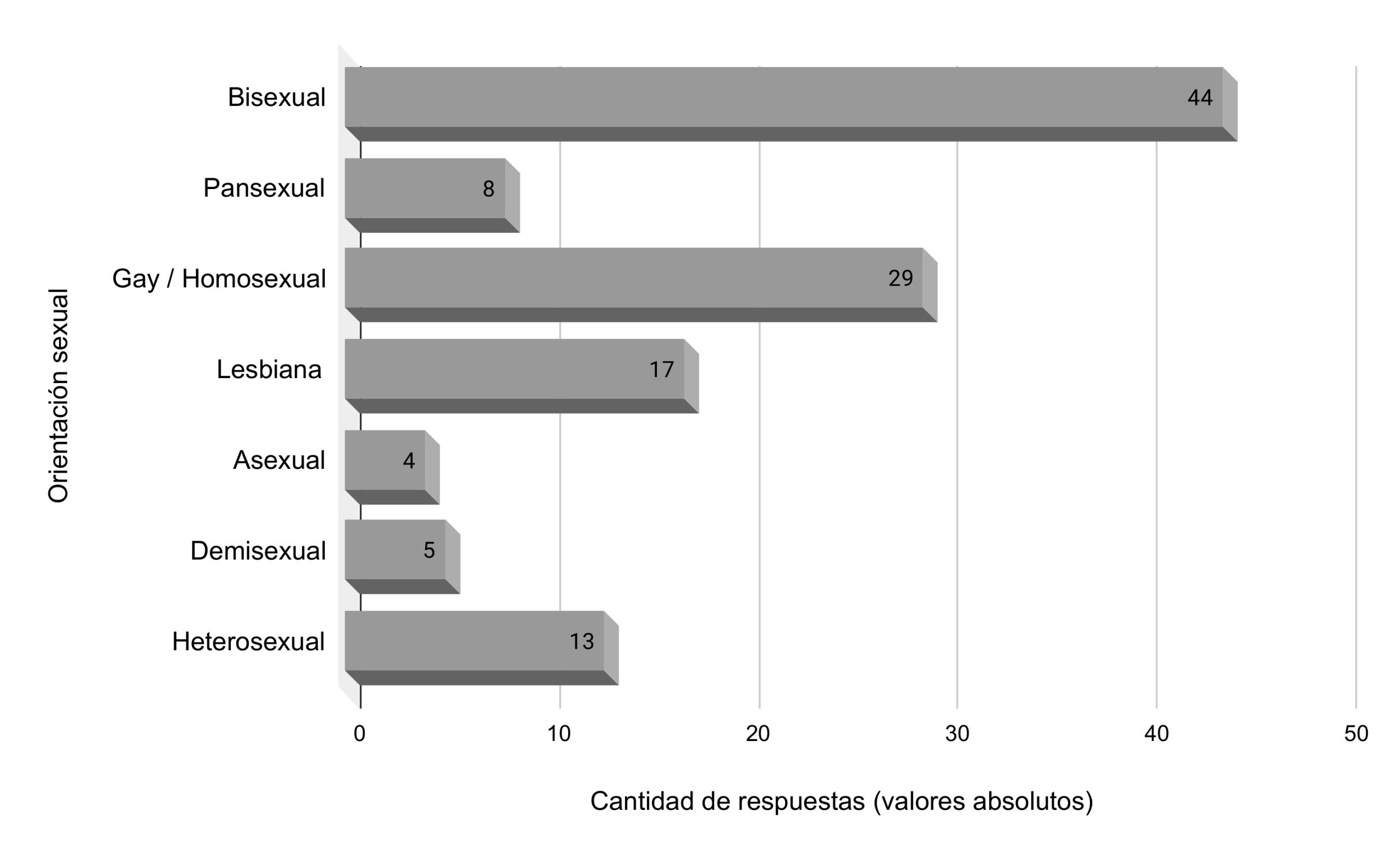 En la pregunta sobre orientación sexual en la encuesta (sección 2), se ofrecieron las siguientes opciones de respuesta: lesbiana, gay, homosexual, bisexual, asexual, pansexual, demisexual y heterosexual[3]. También estaban las opciones “no lo sé”, “prefiero no responder” y “otra”. En el caso de la pregunta que indagó sobre identidad de género, en la sección 3 de la encuesta, las opciones de respuesta fueron las siguientes: mujer trans (transexual, transgénero), travesti, mujer cis, varón trans, varón cis, persona no binaria y género fluido, allende las mencionadas “no lo sé”, “prefiero no responder” y “otra”. En ambos casos, esta selección tuvo motivaciones estadísticas, tales como evitar la exhaustividad categorial que impacte en el análisis de los datos.