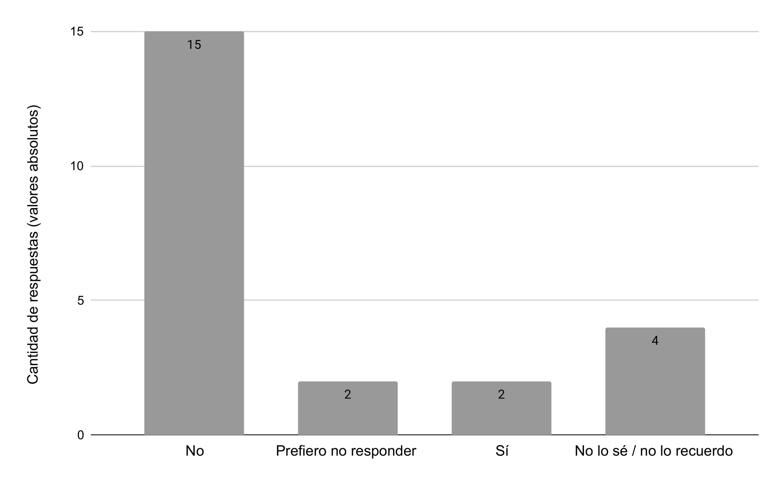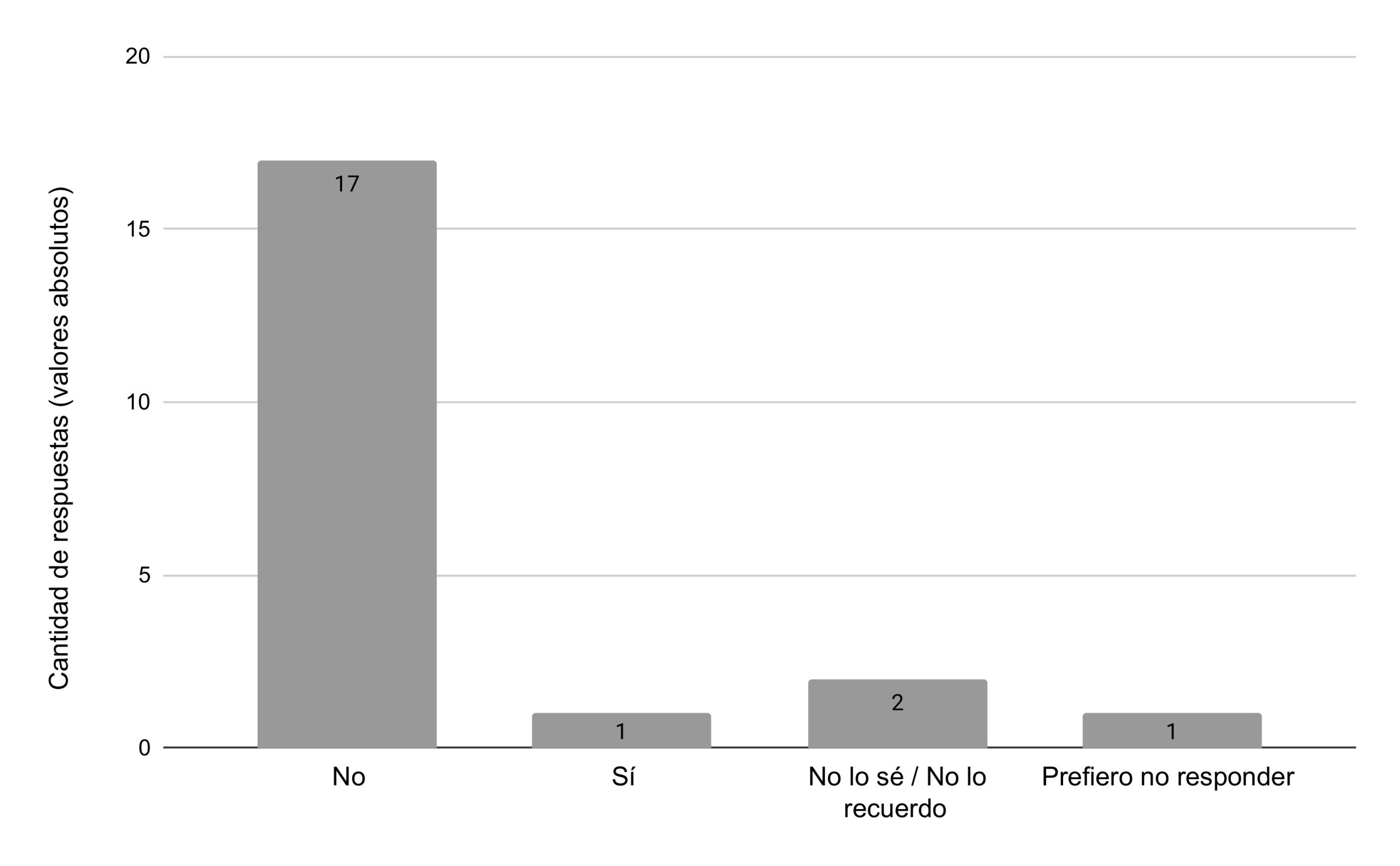 En cuanto a las reacciones al compartir la identidad de género con el círculo familiar, los números también difieren con respecto a la misma pregunta en la sección sobre OS. A modo de recordatorio, la pregunta llevaba el encabezado “Cuando compartiste o se enteró sobre tu identidad de género, esta persona…”, y sus resultados fueron los siguientes: (i) “reaccionó con preocupación”, con 11 respuestas afirmativas y 6 negativas, observándose una clara inclinación de la respuesta hacia la preocupación como reacción; (ii) “reaccionó con aceptación, amor y/o palabras de aliento”: esta arrojó resultados casi diametralmente opuestos a la anterior: el “sí” tuvo 5 respuestas mientras que 12 personas consideraron que no hubo una reacción amorosa o de aceptación.