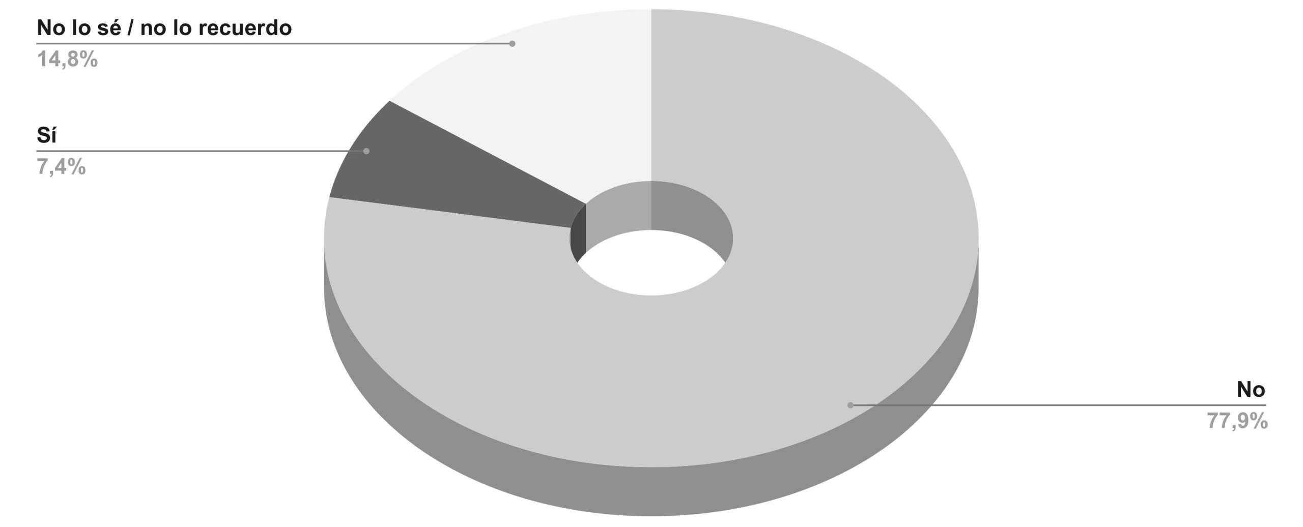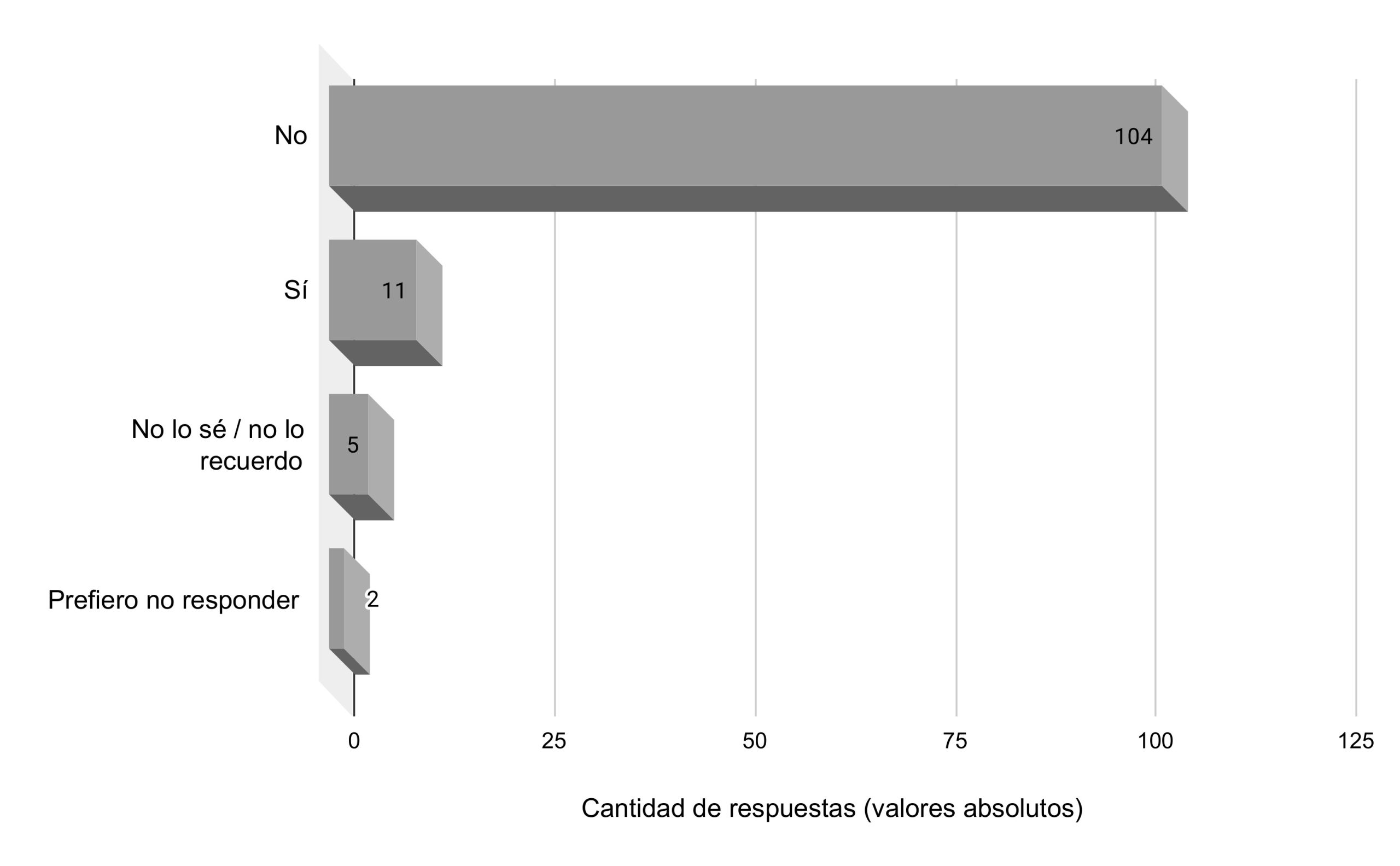 Una pregunta de refuerzo en la misma sección que estamos analizando aquí sirvió para repreguntar sobre posibles situaciones de discriminación en función de la OSIGEG, esta vez sin necesariamente asociarla a ninguna etapa de la carrera en particular. El 9 % de las respuestas fueron afirmativas, lo que equivale a 11 personas de un total de 122 que respondieron esta pregunta. En tanto que dos personas (1,6 %) se inclinaron por la opción “prefiero no responder” que, por la magnitud de la pregunta, posiblemente indique que sí atravesaron una situación discriminatoria pero optan por no hacer comentarios al respecto. Luego, un 4,1 % marcó “no lo sé / no lo recuerdo”, que equivale a 5 personas.