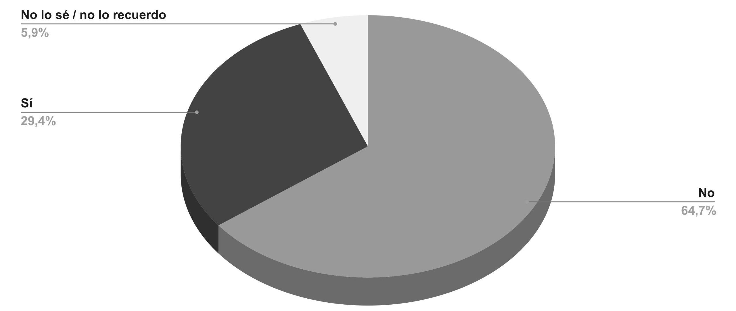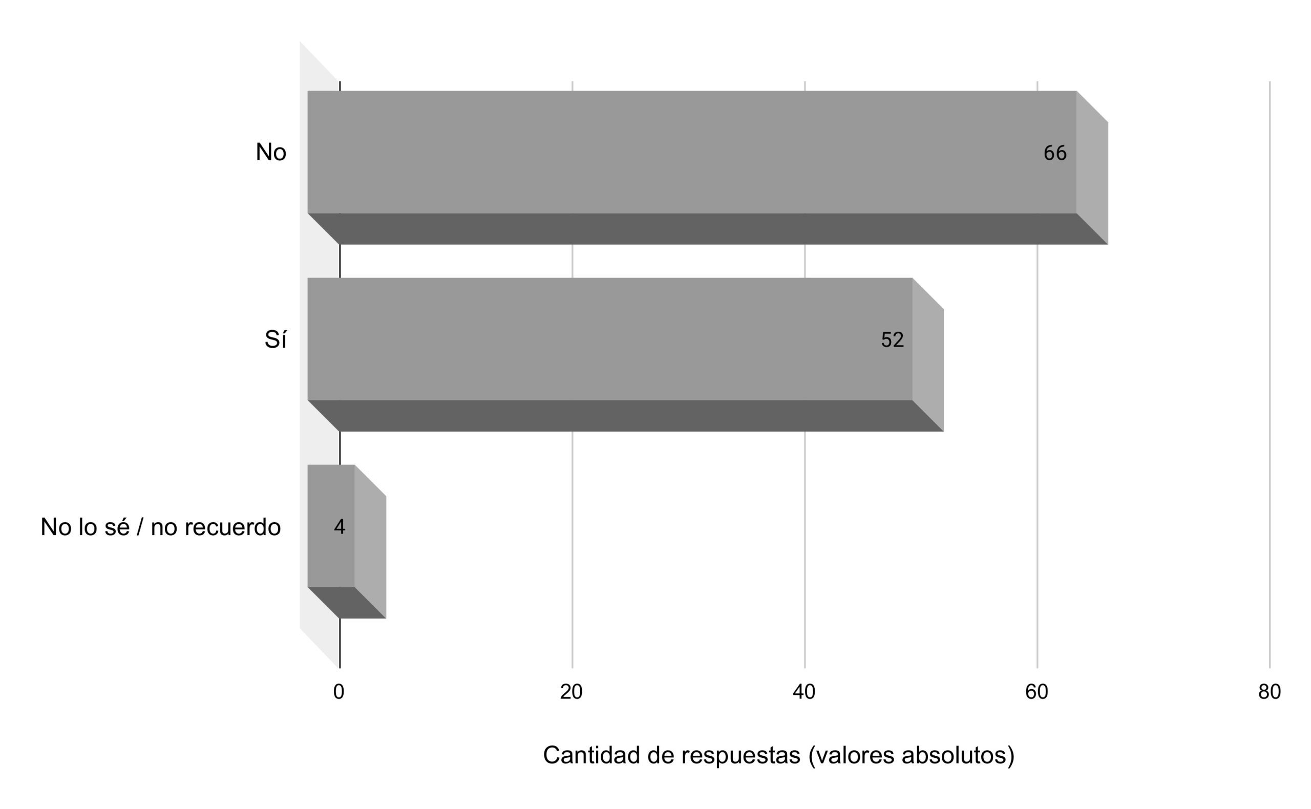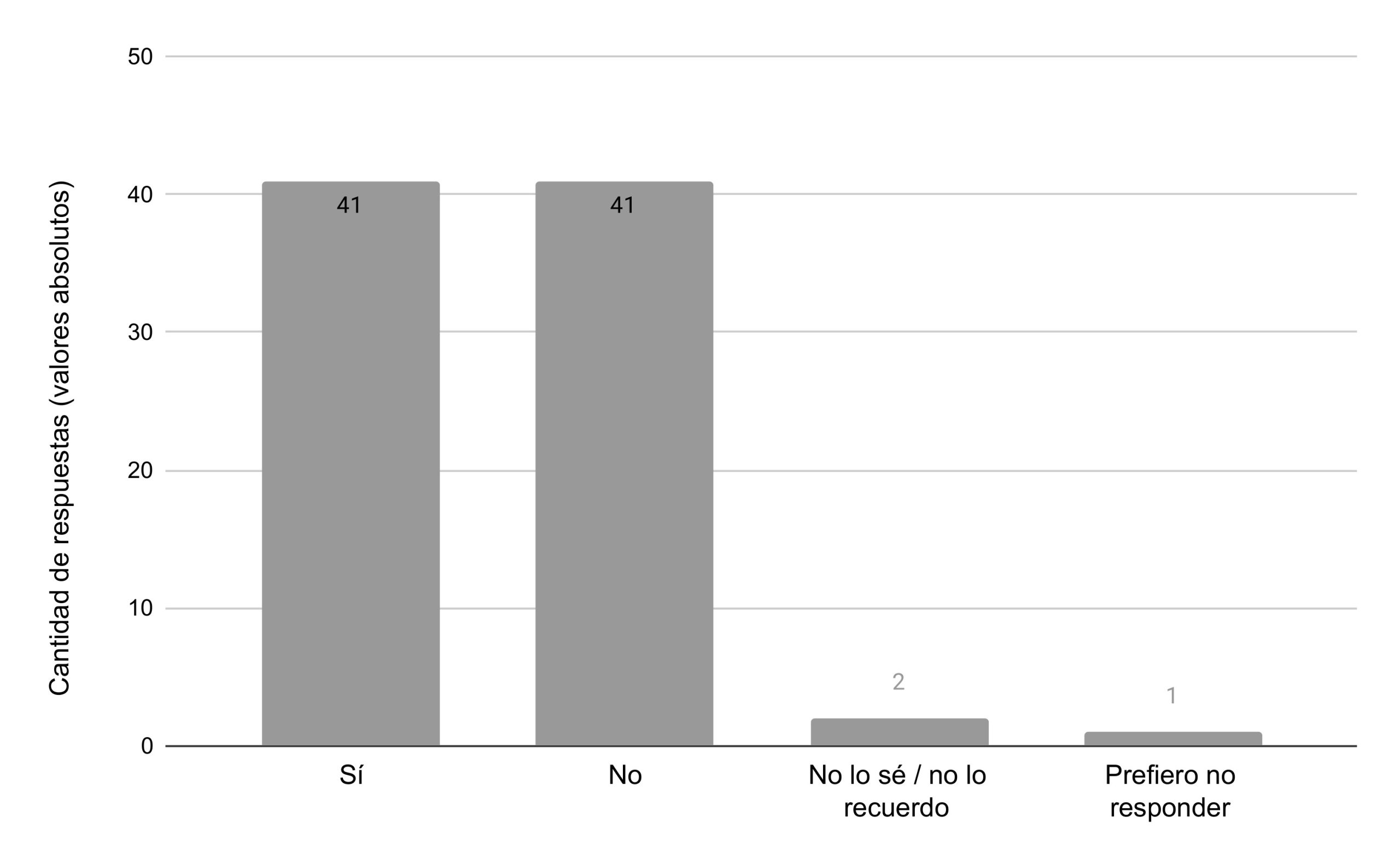 Al indagar sobre el grado de conocimiento de la identidad de género en la familia nuclear, los valores difieren notoriamente respecto de aquellos encontrados en la pregunta homóloga sobre orientación sexual. Se advierte que la respuesta a la pregunta “¿Tiene conocimiento de tu identidad de género tu mamá, papá o persona/s a cargo de tu crianza? ¿O bien tu/s hermana/s, hermano/s o hermane/s?” acercó mucho más los valores entre el sí y el no en las 32 respuestas a esta pregunta. Un 46,9 % declaró que sus familiares no tienen conocimiento sobre su identidad de género (15 personas), mientras que más de la mitad declaró haberla socializado; es decir, un 53,1 % o 17 participantes.