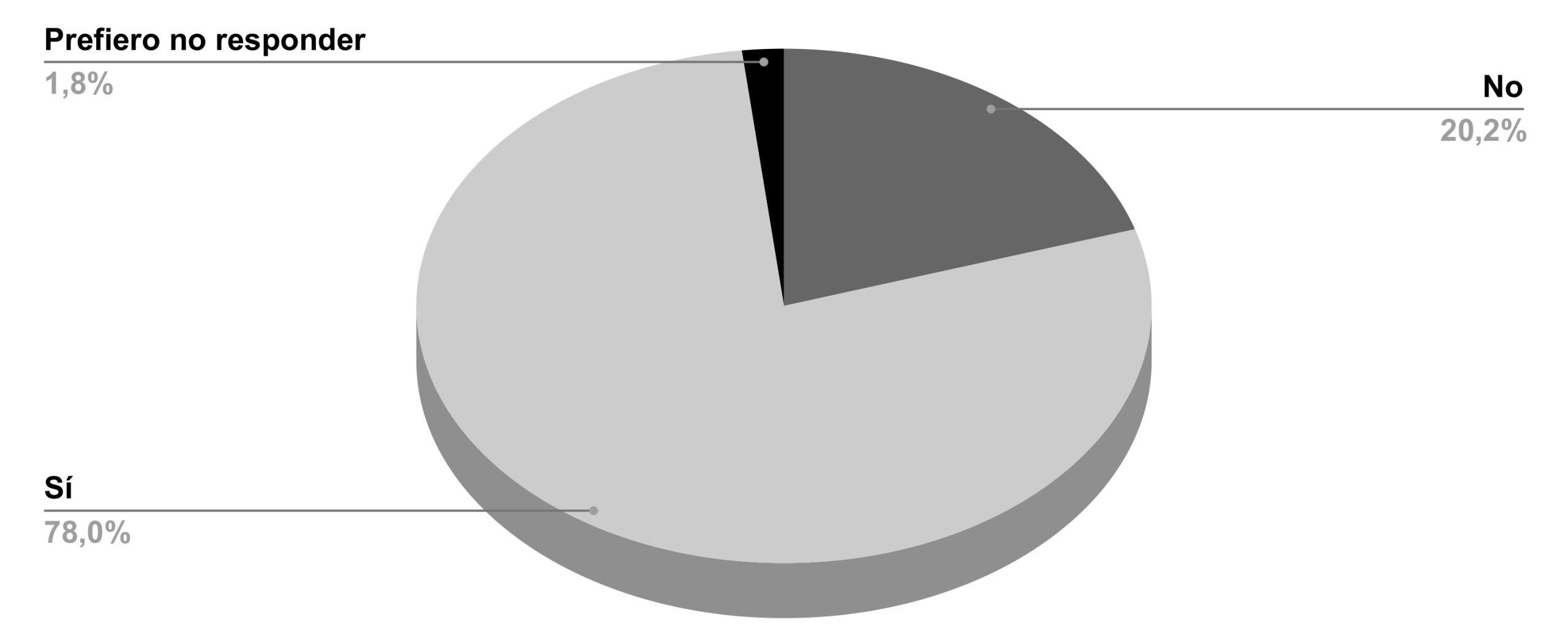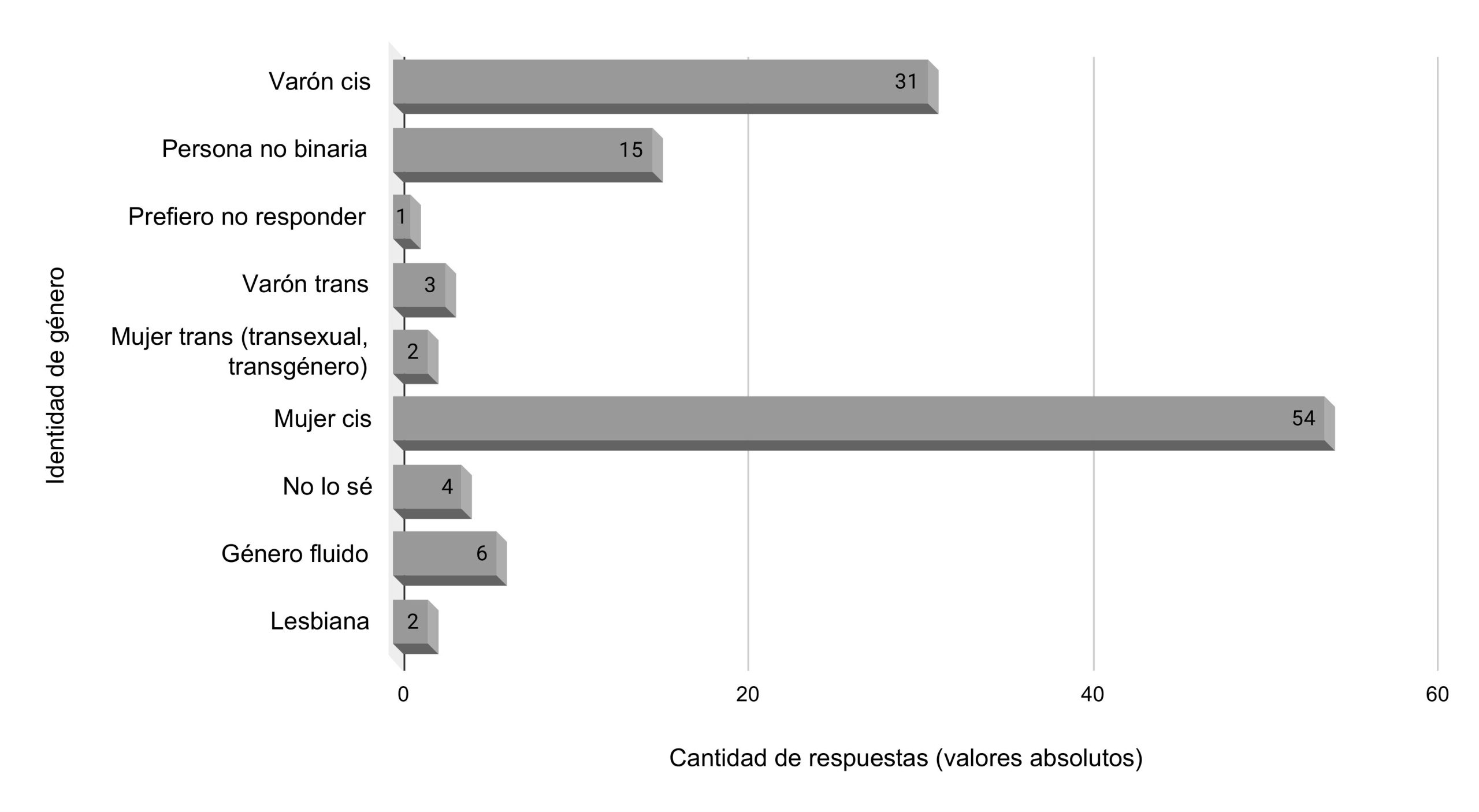 Al preguntar por la identidad de género, las identidades consideradas no cis dieron los siguientes valores: persona no binaria (15 respuestas), género fluido (6), varón trans (3) y mujer trans (2). A ello se suman categorías emergentes[6]: lesbiana (como identidad), con 2 respuestas, marica no binarie (1 respuesta) y demiboy (1). En términos porcentuales, el total de identidades no cisgénero (entre categorías predefinidas y emergentes) asciende a 23,1 % del total de respuestas. En tanto, la identidad cisgénero fue mayoritaria, y totalizó 80 personas entre mujeres cis (54 respuestas) y hombres cis (31).