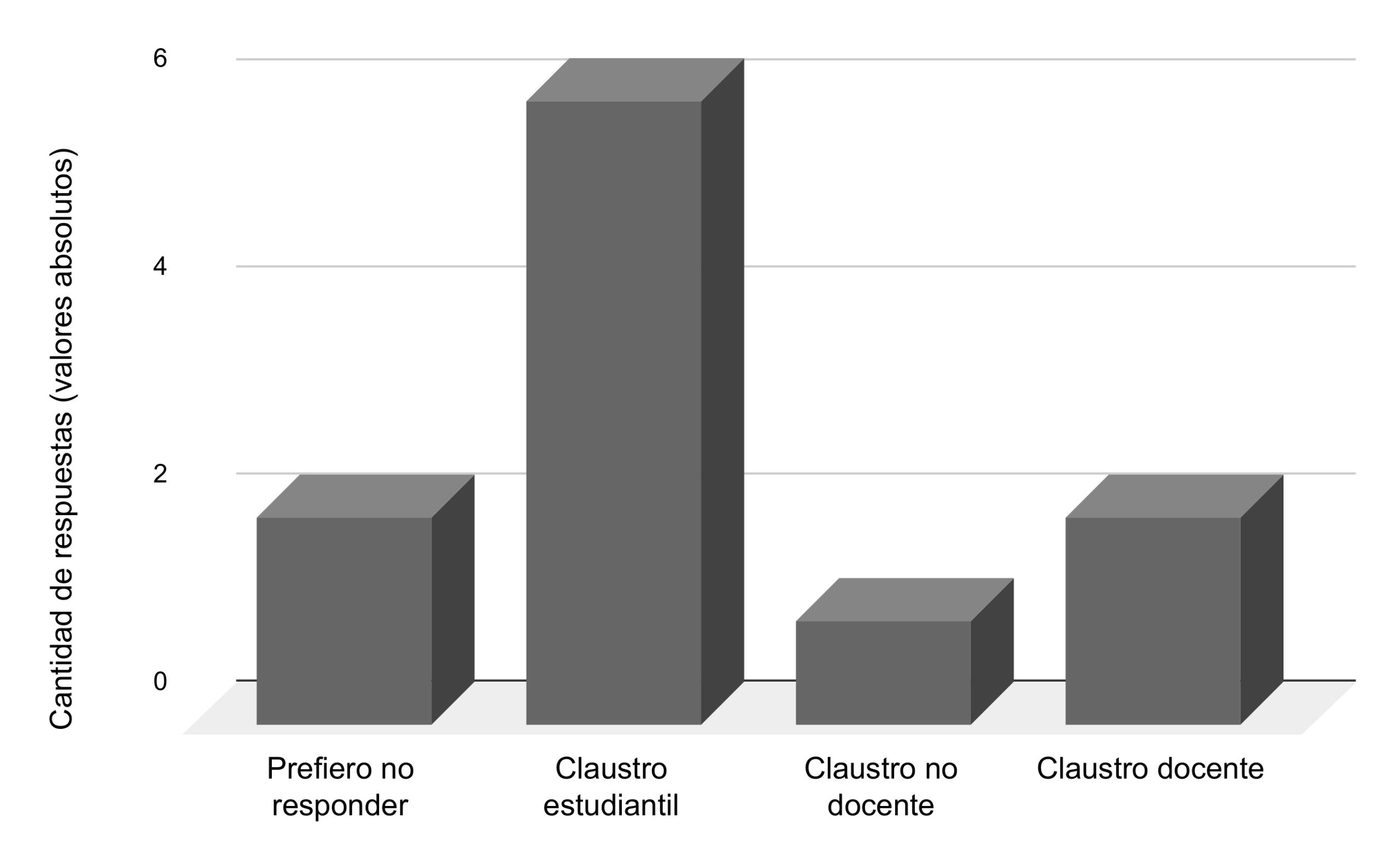- La pregunta hace alusión a los claustros docente, estudiantil y no docente (personal de la universidad). Asimismo, también a autoridades.↵