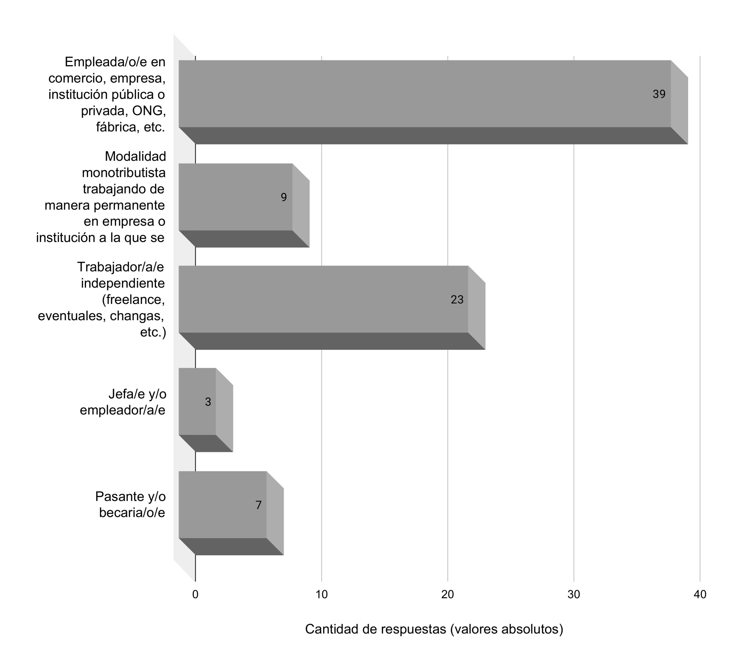 Finalmente, retomando la cifra del 66,4 % que indicó estar realizando alguna clase de trabajo, la siguiente pregunta indagó más específicamente sobre el tipo de inserción laboral. Del universo de 81 personas que respondió esta pregunta, un 48,1 % (39 personas) indicó que realiza un trabajo en comercio, empresa, institución pública, ONG, fábrica, etcétera. En tanto que un 28,4 % (23 personas) se considera trabajador/a/e independiente (que incluye los mencionados freelance, trabajos eventuales, changas, etc.). Es interesante observar que un 11,1 % (9 personas) es monotributista, categoría que incluyó a quienes, teniendo una relación laboral permanente con una empresa o institución, le facturan por servicios prestados en lugar de estar en relación de dependencia[43]. Finalmente, quienes están como pasantes o reciben alguna beca representaron el 8,6 % (7 respuestas).