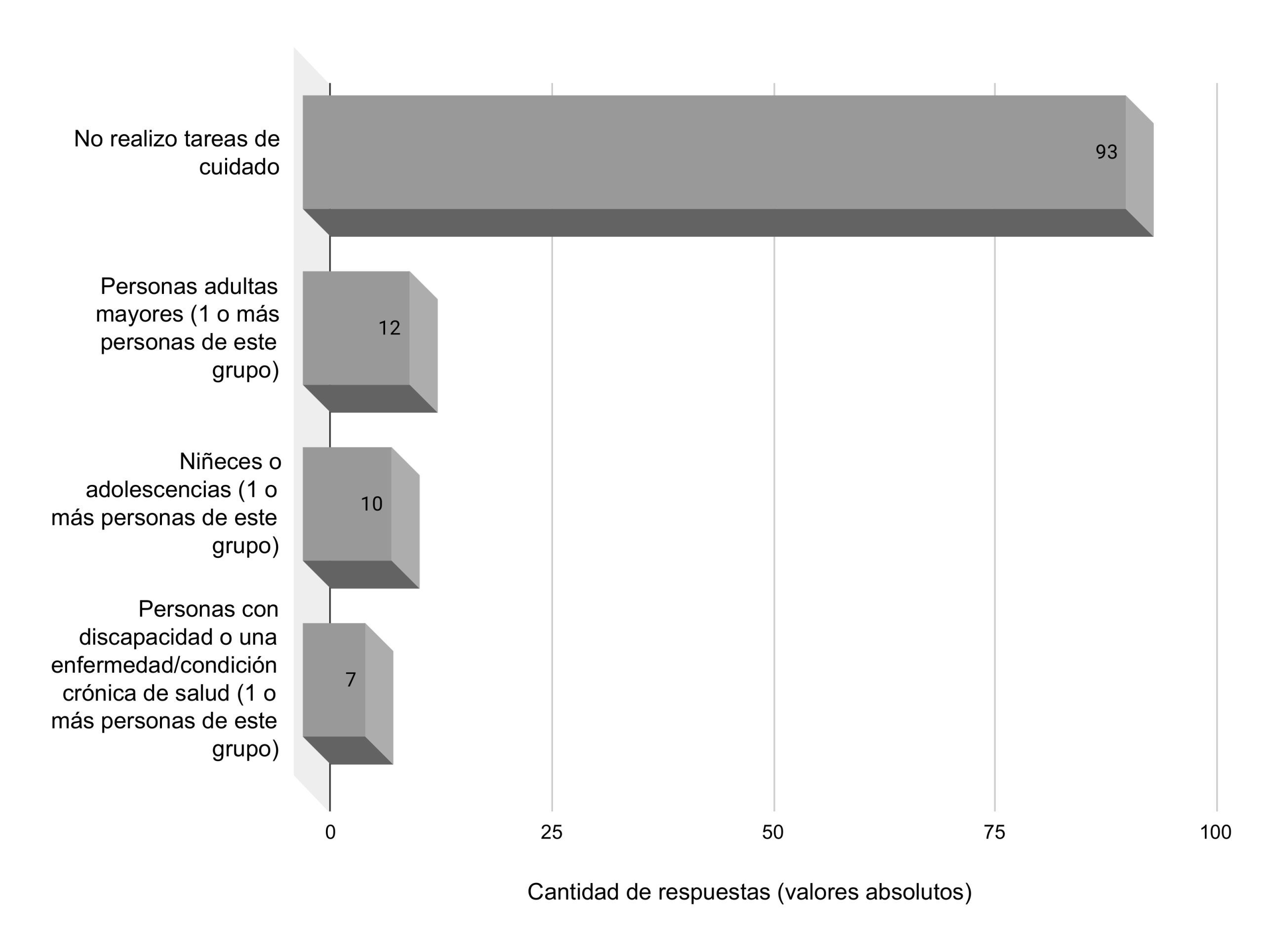 Como puede observarse, una mayoría de estudiantes LGBTIQ+ en la UNSAM no se encuentra al cuidado de otras personas. Puede deberse, por un lado, a que el rango etario es predominantemente joven, además de constituir población universitaria. Existen diversos estudios que dan cuenta de los bajos índices de mujeres que, siendo estudiantes universitarias, deciden maternar. Por ejemplo, en la Universidad Autónoma Metropolitana Azcapotzalco de México, el rango de estudiantes que eran madres era menor al 6 % (Miller y Arvizu, 2016). Sumado a ello, al haber trabajado con población LGBTIQ+ en nuestra encuesta, la diversidad de géneros excede a la categoría mujeres o personas con deseo de maternar/paternar. Pero, fundamentalmente, existen particularidades al trabajar con población de la diversidad de sexo-género que la distinguen del grupo cis heterosexual. Por ejemplo, según una investigación de SAGE, las personas LGBTIQ+ tienen “cuatro veces menos probabilidades de tener hijos” (2021, sin p.) que sus pares cis heterosexuales. Esto, por ejemplo, podría ser una razón que justifique los bajos índices de cuidado de niñeces y adolescencias declarados en nuestra encuesta. Pero, otra vez, no debemos olvidar que el factor etario y el carácter universitario de nuestra población juega un papel importante en estas decisiones.