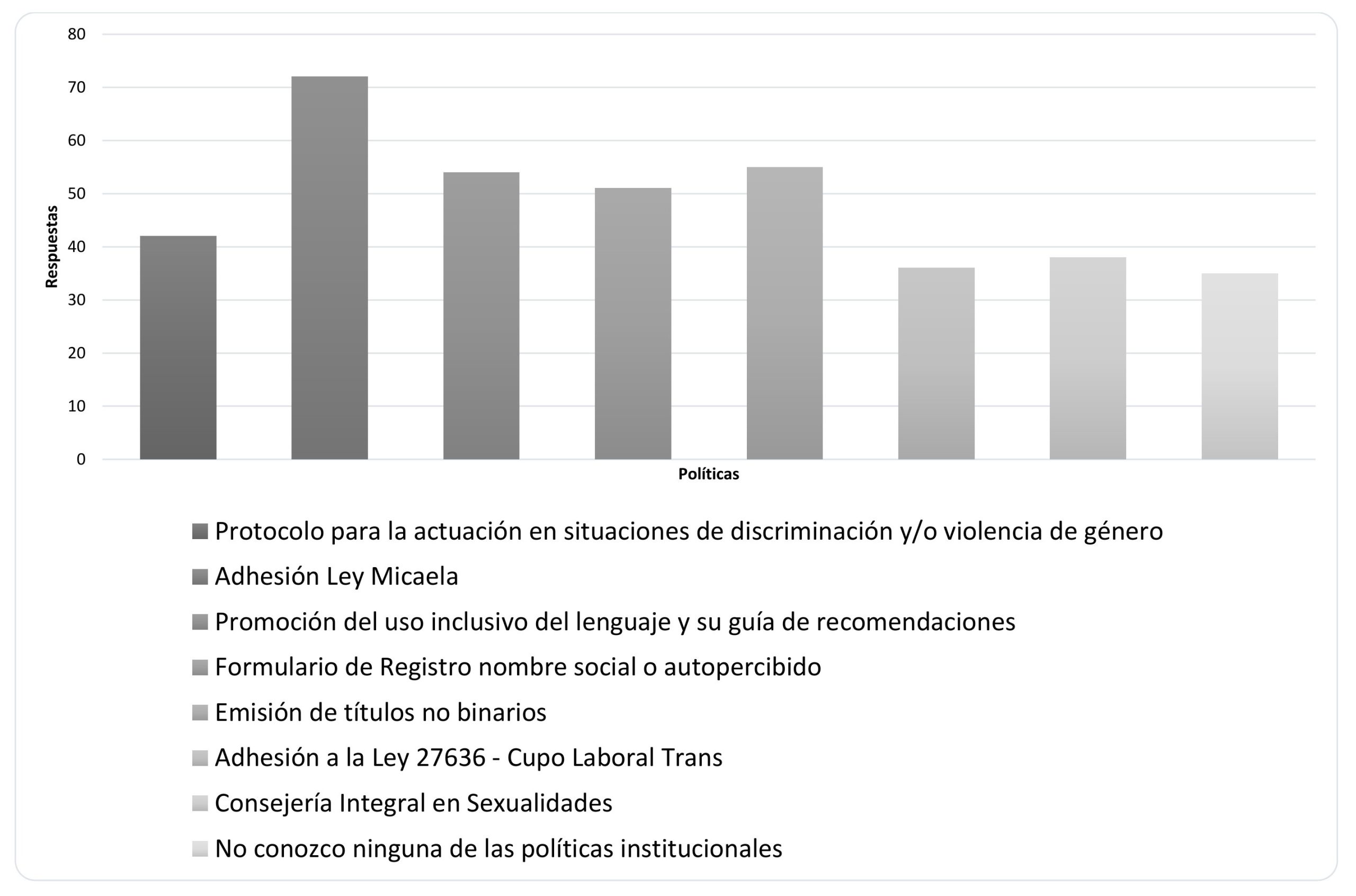Casi el 30 % de lxs encuestadxs no conoce ninguna de las políticas, y por otro lado, el 34,5 % conoce el protocolo. Consideramos importante detenernos en estos dos aspectos, ya que el acceso a la información es un pilar fundamental para el ejercicio de los derechos. En este sentido, resulta clave indagar respecto de las unidades académicas y la etapa de la trayectoria universitaria a la que pertenecen dichos estudiantes para fortalecer acciones de comunicación y sensibilización en la temática a los fines de ampliar su alcance. También se considera fundamental analizar y fortalecer el rol de docentes y no docentes respecto del acompañamiento en la implementación de las políticas de género y diversidad tanto en lo que respecta a brindar información sobre la Dirección y las normativas institucionales, como sobre la posibilidad de articulación ante la identificación de situaciones que puedan afectar la permanencia de lxs estudiantes.