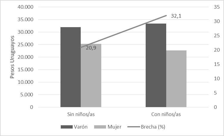 Gráfico 3: Promedio de ingresos mensuales de la ocupación principal y brechas de género en la población en hogares con y sin niños/as pequeños/as. Uruguay, 2017