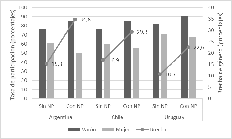 A modo general, se encuentra que, al pasar de los hogares sin niños pequeños a los hogares con estos niños, las tasas de actividad masculinas aumentan y las tasas femeninas disminuyen. Este fenómeno, que se repite en los tres países, muestra diferencias entre los casos. Argentina aparece como el caso más marcado, pues la tasa de actividad femenina cae casi 11 puntos porcentuales y la brecha de género crece a más del doble del valor que registran los hogares sin niños. Como resultado, las argentinas en hogares con niños pequeños enfrentan la mayor brecha (34,8 %). En segundo lugar, está Chile ya que, si bien la variación en la participación masculina es similar a la argentina, la participación femenina chilena no cae con tanta intensidad. En tercer lugar, se encuentra Uruguay, que presenta los menores niveles de desigualdad.