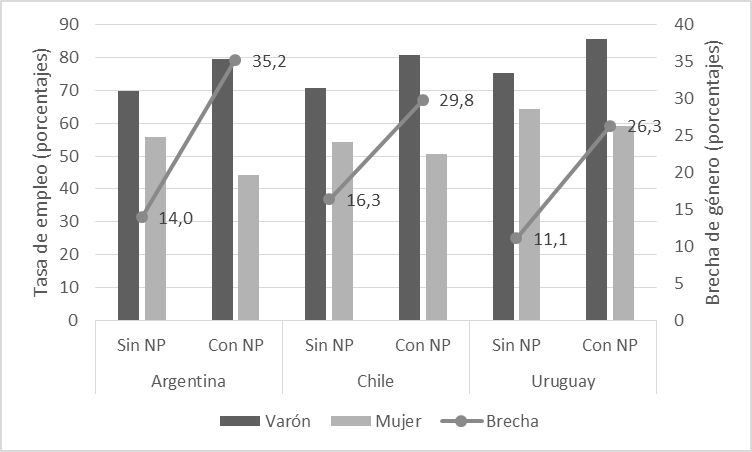 Gráfico 5: Tasa de empleo y brechas de género en la población en hogares con y sin niños/as pequeños/as. Argentina, Chile y Uruguay, 2017a