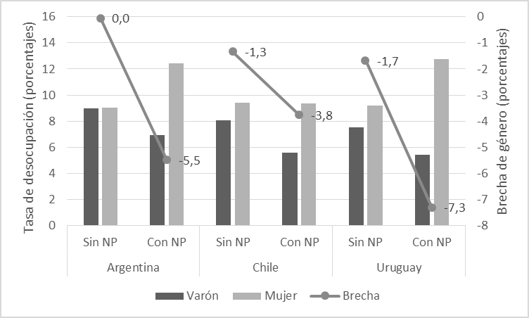 Gráfico 6: Tasa de desocupación y brechas de género en la población en hogares con y sin niños/as pequeños/as. Argentina, Chile y Uruguay, 2017a