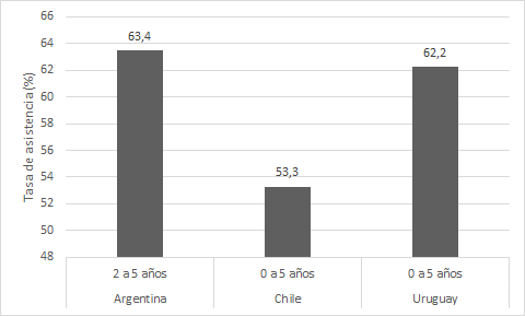 b La EPH en Argentina no releva la asistencia para menores de 2 años, cuestión que puede distorsionar los datos, debido a que toma en su conjunto las edades de 3, 4 y 5, siendo estas dos últimas parte del ciclo obligatorio del nivel inicial, por lo que presenta las mayores coberturas; c En Argentina la EPH no permite diferenciar entre establecimiento no formal y formal de AEPI como sí lo permiten las encuestas de hogares de Chile y Uruguay.