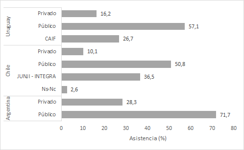 Respecto a los servicios públicos de establecimientos de AEPI no formales, se presentan grandes diferencias entre los países. Por un lado, el acceso a estos servicios se presenta en proporciones similares en Uruguay y Argentina (tomando en consideración población destinataria y demanda satisfecha), siendo en Argentina más baja (sólo el 22 % de la demanda potencial accede, según Rozengardt, 2020 para SITEAL UNESCO). Mientras que, en Chile, el acceso se presenta más extendido (cerca del 60 % de la población destinataria accede a los servicios, según datos de la Subsecretaría de Educación Parvularia). Otras grandes diferencias se evidencian en relación con el tipo de jornada de los servicios, el criterio de acceso y la participación familiar.