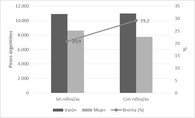 Gráfico 1: Promedio de ingresos mensuales de la ocupación principal y brechas de género en la población en hogares con y sin niños/as pequeños/as. Argentina, II-2017