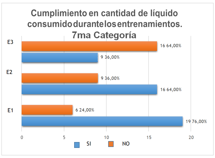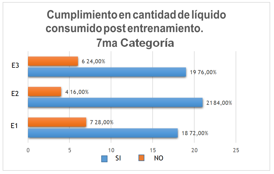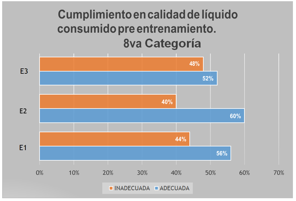 En el Entrenamiento 1, el 60%(n=16) de los jugadores no cumplió con la recomendación de calidad de líquidos post entrenamiento, mientas que el 40%(n=11) sí. En el Entrenamiento 2, el 68%(n=18) de los jugadores cumplió con la recomendación y el 32%(n=9) no. En el Entrenamiento 3 los porcentajes de cumplimiento o no fueron iguales al E1.