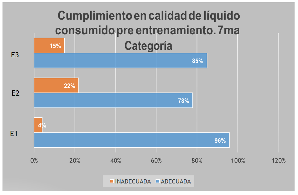 El protocolo de hidratación Pre entrenamiento del E1, E2 y E3, tuvo una frecuencia de cumplimiento Baja en un 7 %(n=2) de los jugadores, Media en un 26% (n=7) de los jugadores y Alta en un 67%(n=18) de los jugadores.