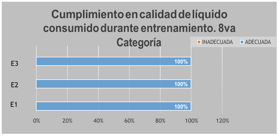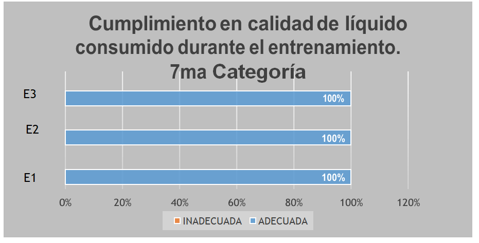 En los 3 entrenamientos el 100% (n=27) de los jugadores cumplió con la recomendación en cuanto a calidad de líquidos durante la práctica deportiva.