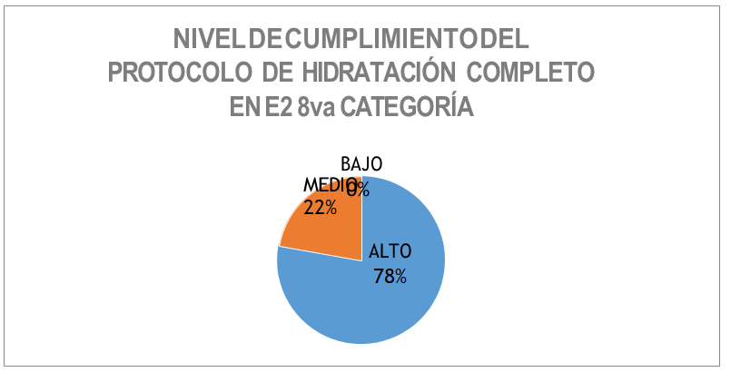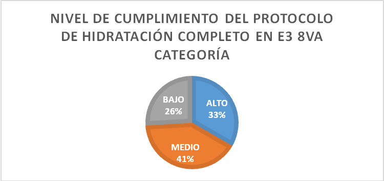 El protocolo de hidratación durante un entrenamiento del E1, E2 y E3, tuvo una frecuencia de cumplimiento Baja en un 7 %(n=2) de los jugadores, Media en un 19% (n=5) de los jugadores y Alta en un 74%(n=20) de los jugadores.