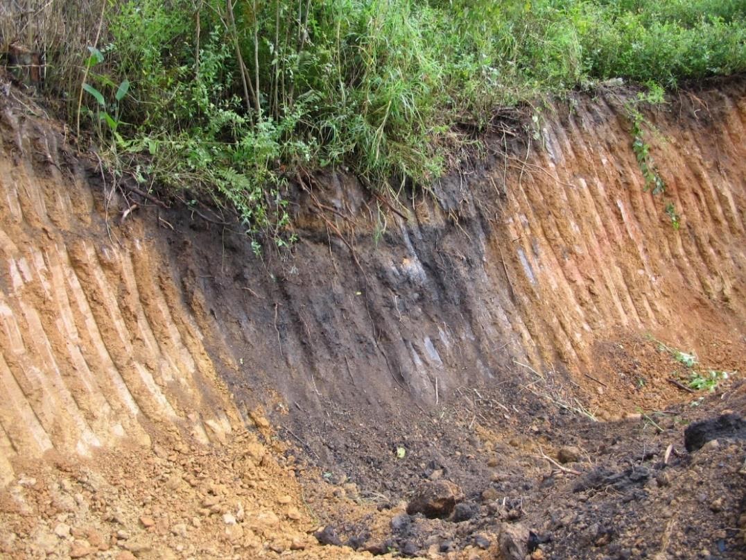 Aspectos geomorfológicos também contribuem para o encobrimento de vestígios do trabalho na paisagem. A Figura 3 mostra um perfil de solo de uma antiga carvoaria localizada no município de Paulo de Frontin (RJ) situada em uma zona de coluvio em um eixo de drenagem, os vestígios da mesma encontram-se até a 1,2 m de profundidade, sendo pouco conspícuos na superfície.