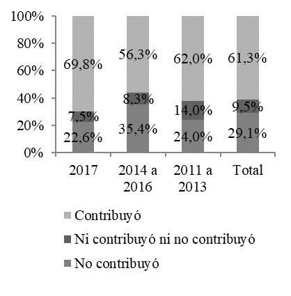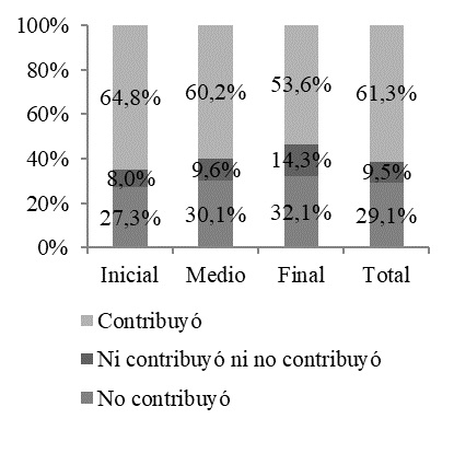 - A los fines de construir una medida resumen para cada práctica, se procedió a calcular la media de la contribución a partir de los valores provistos por las/os estudiantes. Así, al tiempo de que la media se incrementa, esta valoración se aproxima cada vez más al “contribuyó totalmente”.↵