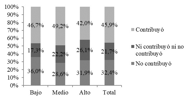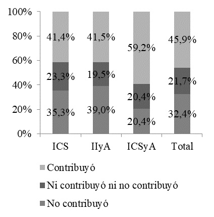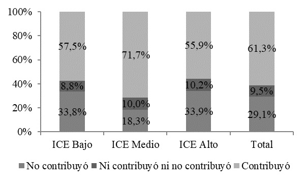 Asimismo, esta práctica refiere mayor aprovechamiento entre quienes cuentan con alguna experiencia universitaria previa, respecto de quienes ingresaron por primera vez a la Universidad: 50% de contribución frente a 42,9% respectivamente. De modo que las Tutorías Docentes se vuelven un factor que adquiere reconocimiento para quienes ya pasaron anteriormente por otra universidad. Luego, al analizar las contribuciones en función del Índice de Contexto Educativo (Gráfico 3.8), observamos que entre quienes se ubican dentro del grupo de estudiantes con ICE – Alto, identifican una contribución menor (42% frente a un 45,9% del total) y que entre quienes incluimos en el segmento ICE Bajo la proporción de “no contribuyó” es mayor que el valor poblacional (36% frente a 32,4% respectivamente). Este aprovechamiento diferencial evidencia una incidencia distinta en las trayectorias estudiantiles de aquellas/os alumnas/os donde la experiencia social de ir a la universidad es prácticamente inédita o bien sus trayectorias en la secundaria presentan una “escolaridad de baja intensidad” (Kessler, 2004 en Terigi, 2007, p. 15) o bien en sus hogares la infraestructura no acompaña del mejor modo la posibilidad de estudiar.
