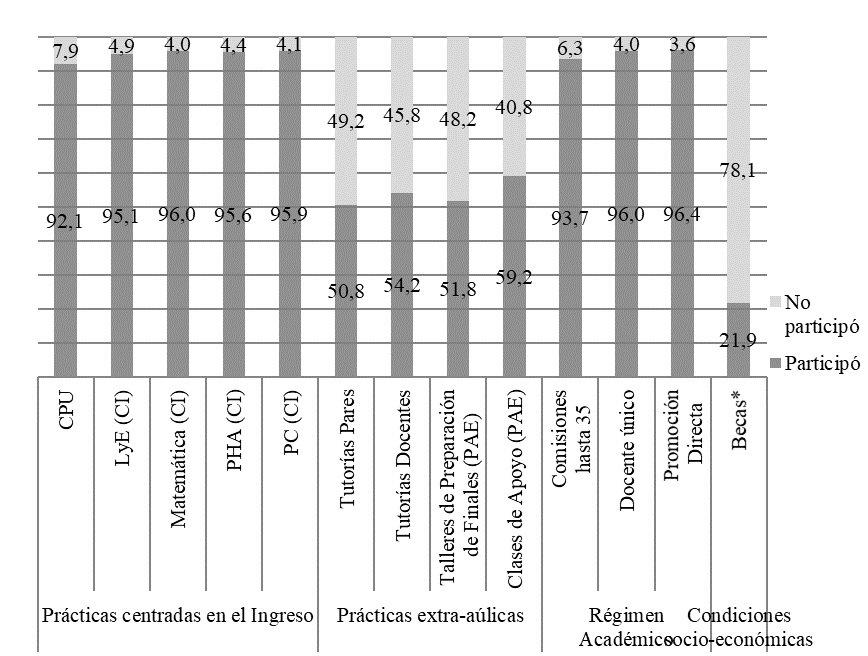 - En la encuesta a estudiantes, preguntamos por la participación en prácticas institucionales correspondientes al ingreso, las extra-áulicas, las becas institucionales y las del régimen académico. Quedaron fuera de ese análisis las vinculadas a graduación y las acciones de acompañamiento administrativo.↵